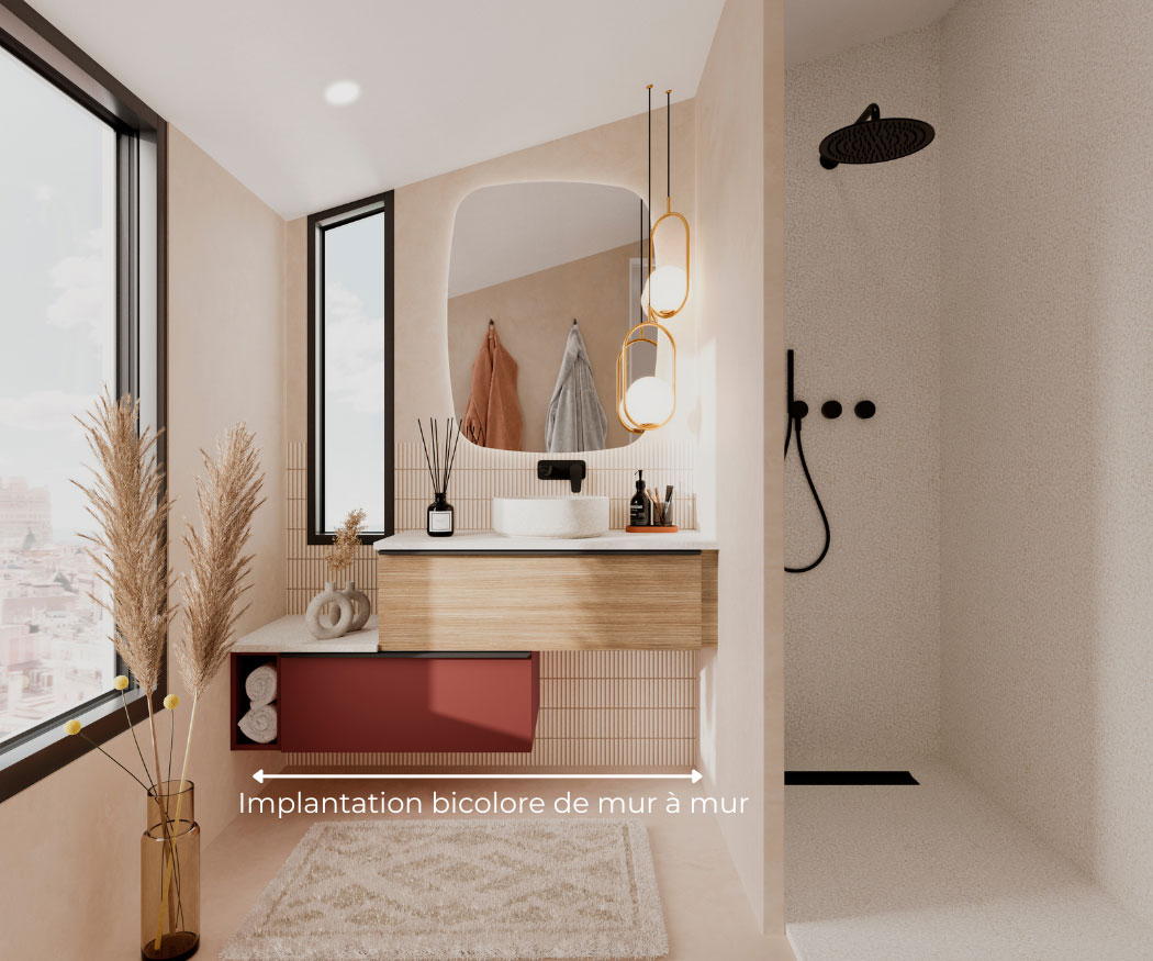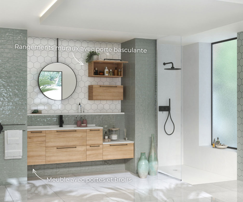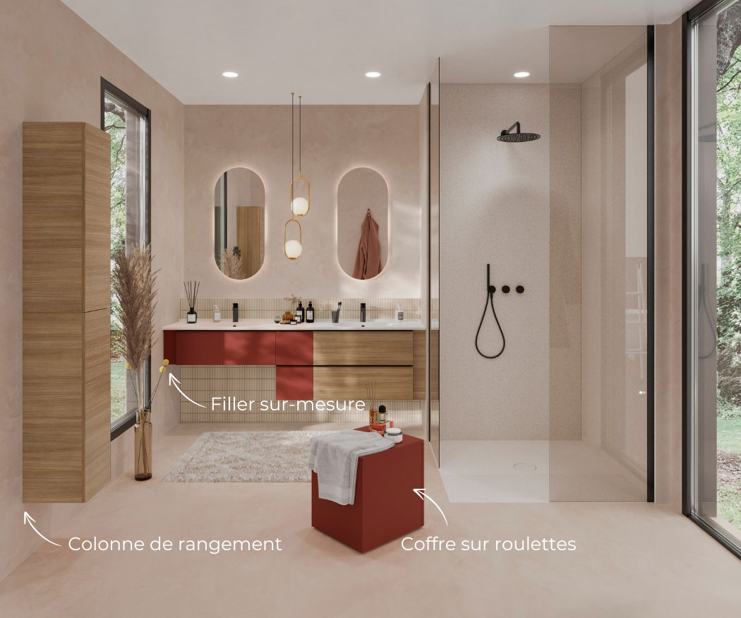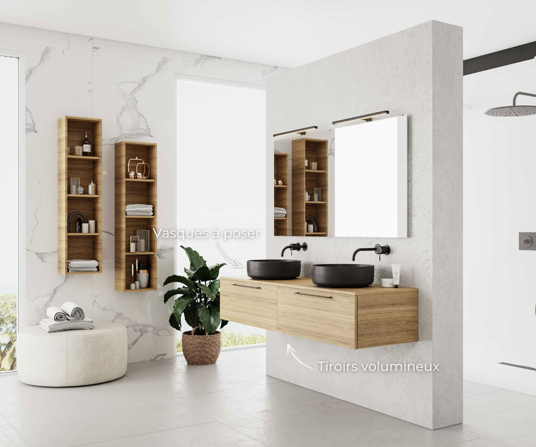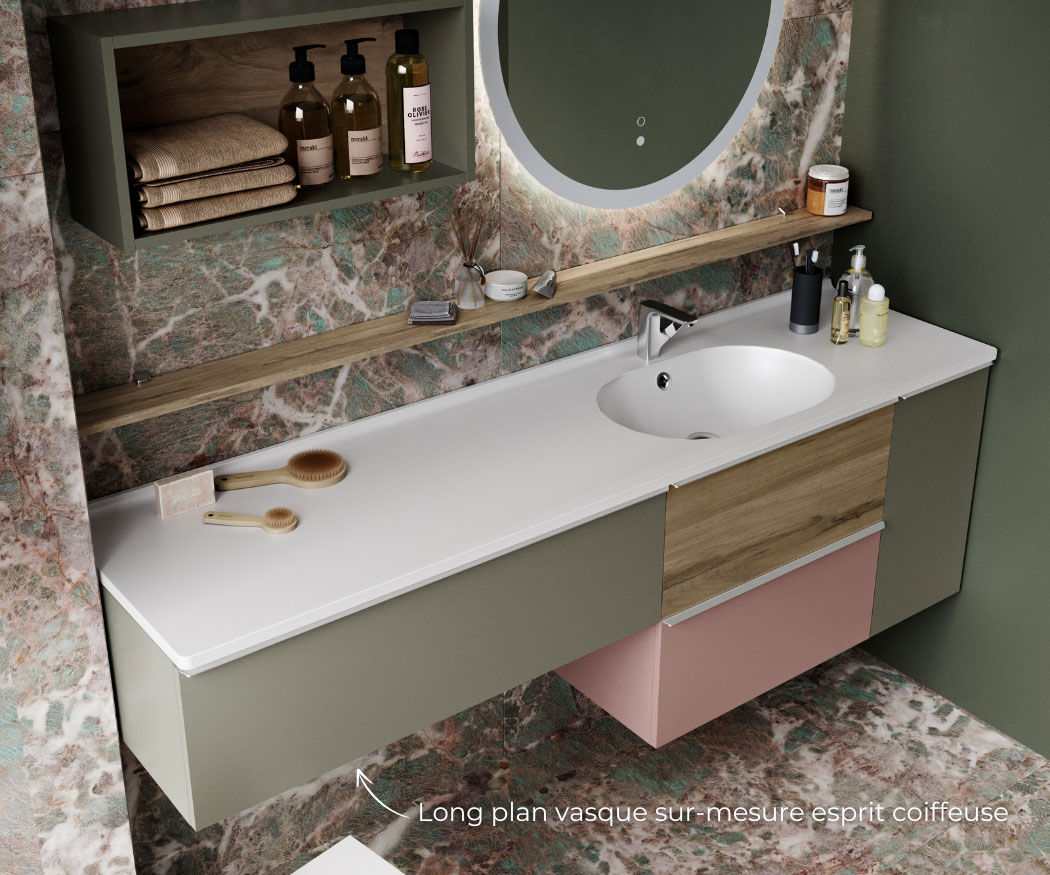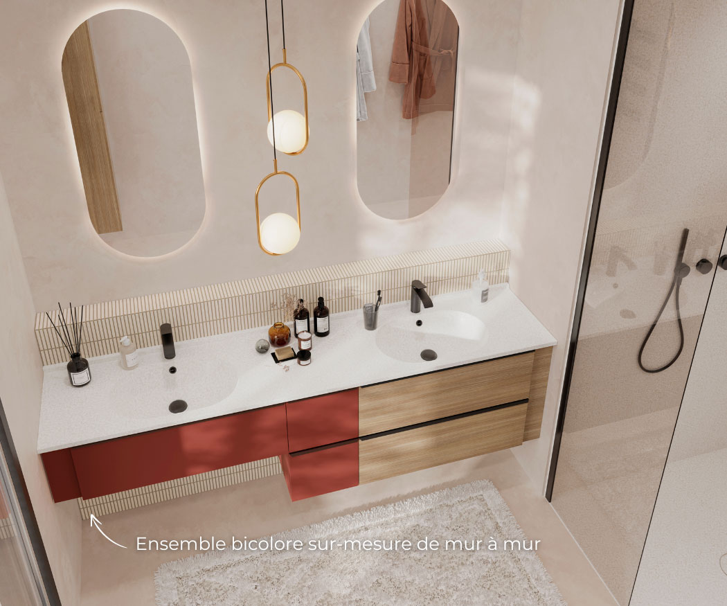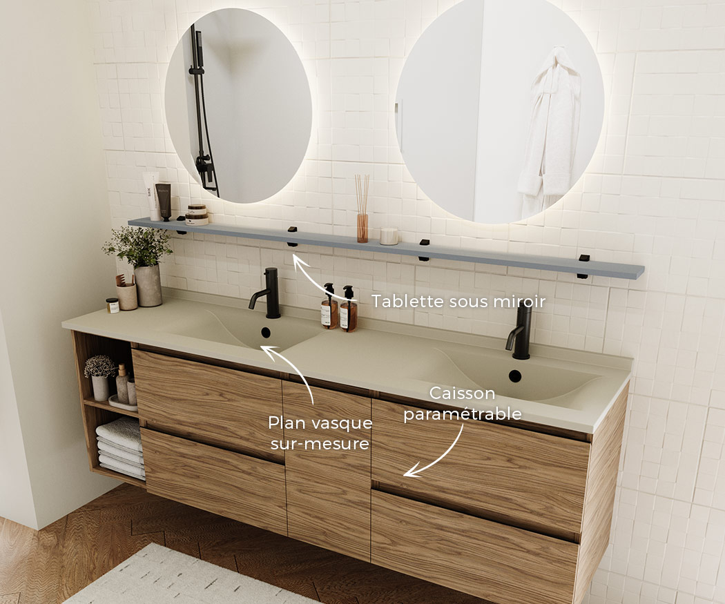 Sélectionnez vos blocs tiroirs et blocs portes, et nous créons sur mesure votre plan vasque adapté, même aux configurations telles que le mur à mur.