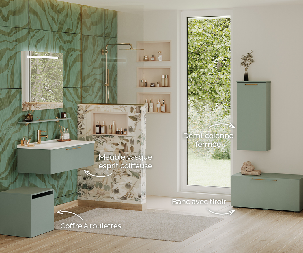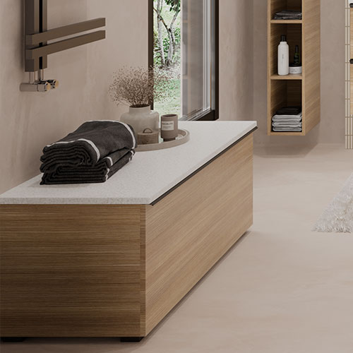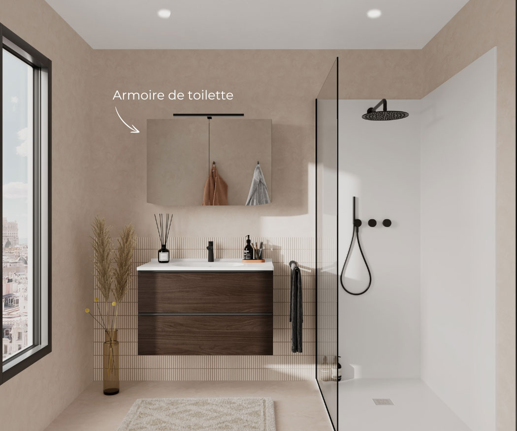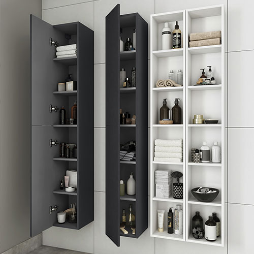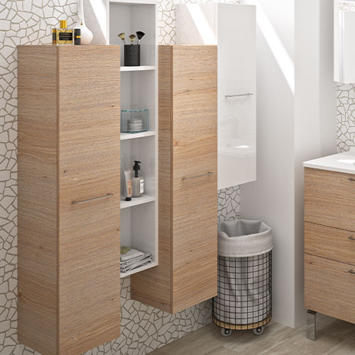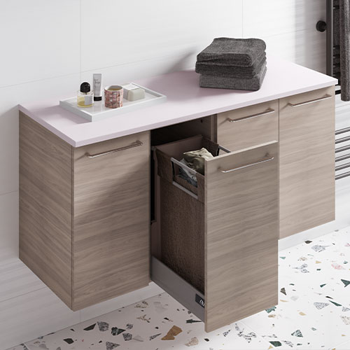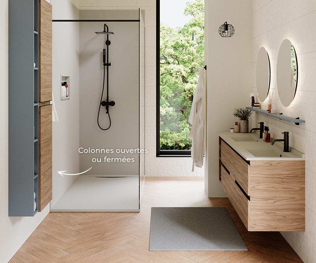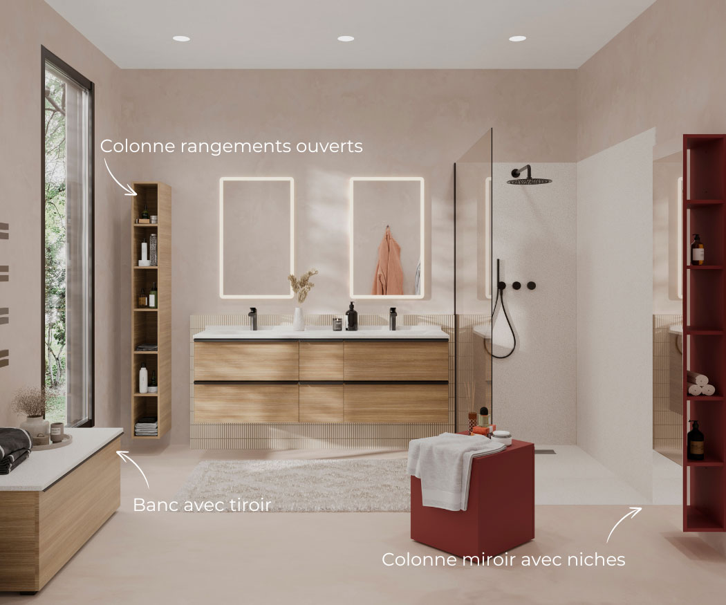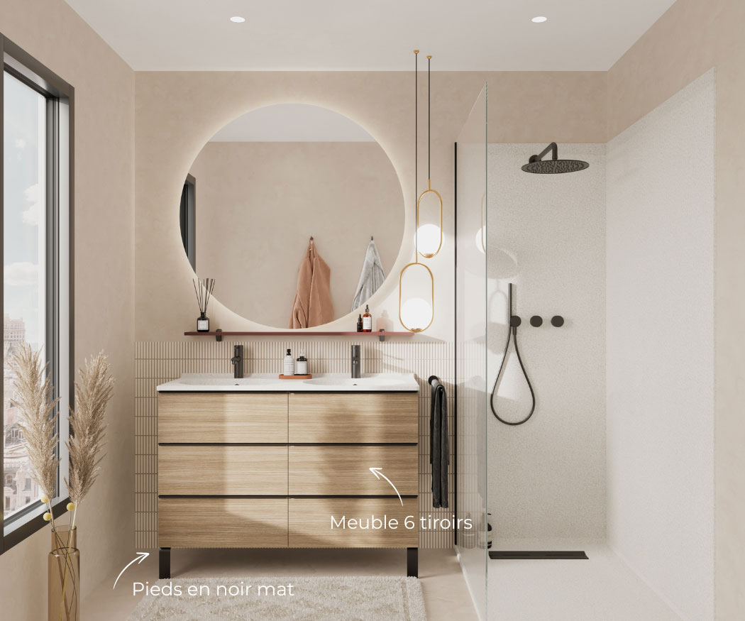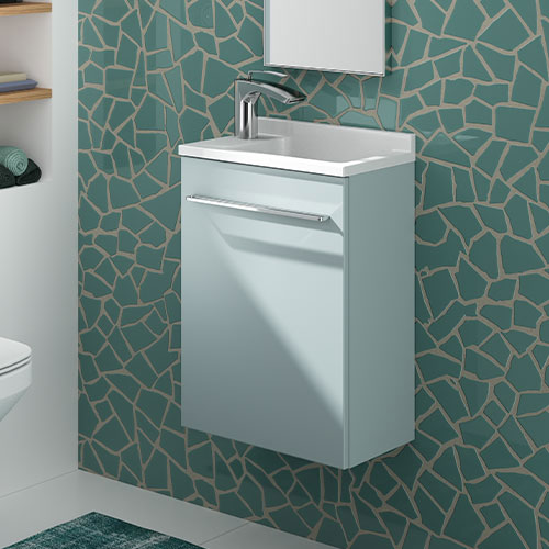 Sélectionnez vos blocs tiroirs et blocs portes, et nous créons sur mesure votre plan vasque adapté, même aux configurations telles que le mur à mur.